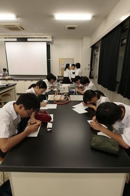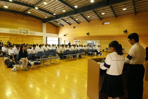 呉青山高校のオープンスクールでは、主に在校生がおもてなしをします。正門でのお出迎え、受付、会場案内、初めに行われる全大会のパフォーマンス、司会進行、学校説明もすべて生徒が行います。特に全体会の最後には、本校の卒業生(愛媛大学理学部)が、呉青山高校の良さや自らの成長を熱く語ってくれました。参加者も在校生も、はじめはお互い緊張していましたが、授業体験、クラブ体験を経て、食堂で一緒にランチをする頃には、わいわい会話が盛り上がっていました!呉青山高校の雰囲気と高校生の温かなおもてなしを体感してくれたのではないでしょうか。