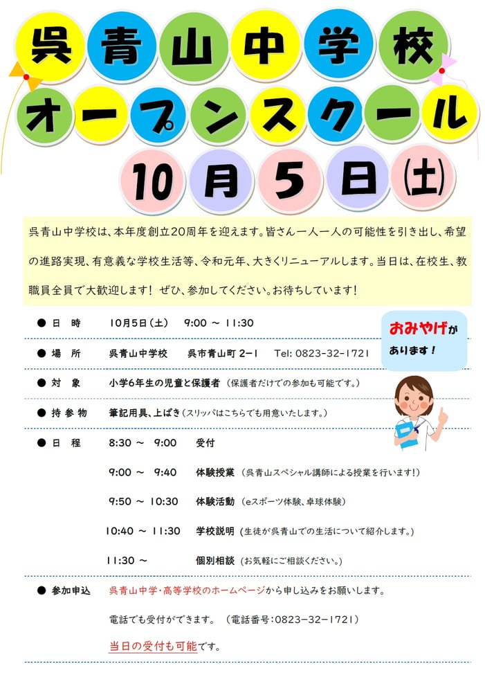 過去ブログ · 2019/08/02 中学オープンスクール 申込受付中 ●対象:小学6年生の児童、保護者 ●日時:令和元年 10月5日(土) 9:00~11:30 参加をお待ちしております。 詳しくはこちらをご覧ください。 終了しました。 tagPlaceholderカテゴリ: recruit