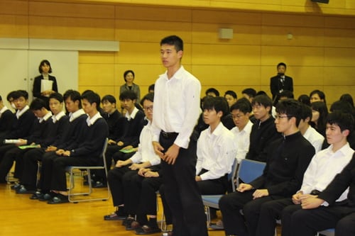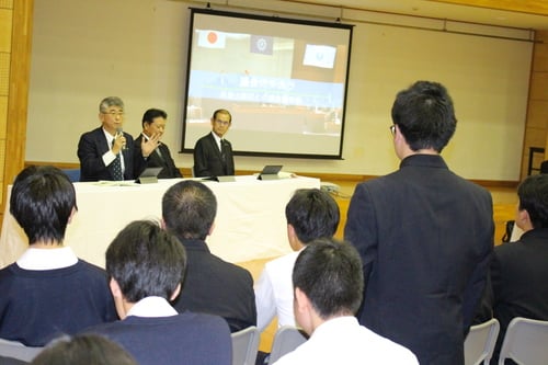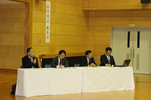 報告会では市議の方々の挨拶に続いて議会の活動報告を受けました。具体的な市議としての仕事と活動について学ぶことができました。特に「政治には無関心でいることはできても無関係でいることはできない」という言葉に、新しく選挙権を手にした生徒たちは政治に対する考えを見直すことができたでしょう。質疑応答は「呉市について思うこと考えていることなど、何でもいいので質問してください」と言われたことで、生徒はたくさん質問を市議の方々にさせていただきました。ある生徒の「地元の道路が去年の災害からずっと片側交互通行なのですが復旧の見通しはどうなのでしょうか」という質問に対して、「すぐに調べて担任に報告します」と力強い返答を即座にいただくなど、市議の方々の仕事を目の当たりにすることができ、市議の方々の熱い思いを実感し身近に感じられたと同時に、大変勉強になったのではないかと思います。とても貴重な経験をすることができました。