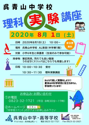 過去ブログ · 2020/06/29 『理科実験講座』申し込み受付中です→終了いたしました 日程:令和2年8月1日(土) 10:00~ 受付 10:30~11:30 理科実験講座 対象:小学6年生と保護者 終了いたしました。ご参加ありがとうございました。 tagPlaceholderカテゴリ: recruit