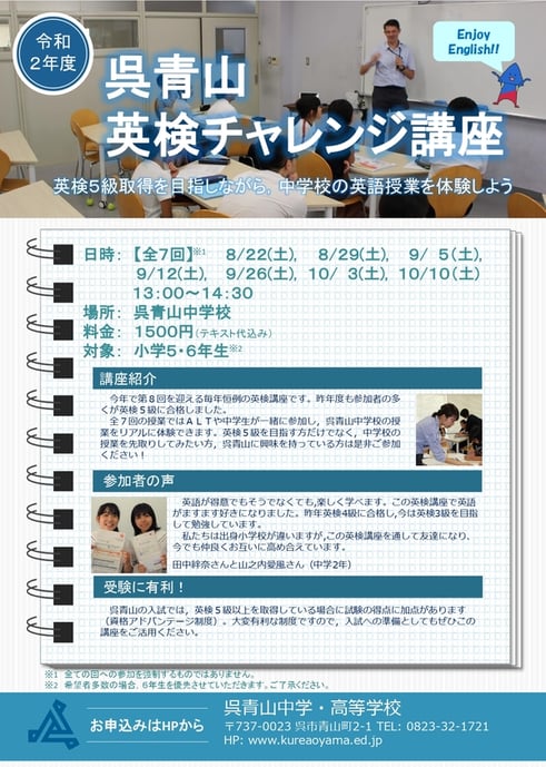 過去ブログ · 2020/06/29 『呉青山チャレンジ講座』 日付(全7回):8月22日(土)・8月29日(土)・9月5日(土) 9月12日(土)・9月26日(土)・10月3日(土) 10月10日(土) 時間:13:00~14:30 対象:小学5・6年生 お申し込みの受付は終了しました。 全7回の講座で英検5級に挑戦します。英語を楽しみながら学びましょう。 tagPlaceholderカテゴリ: recruit