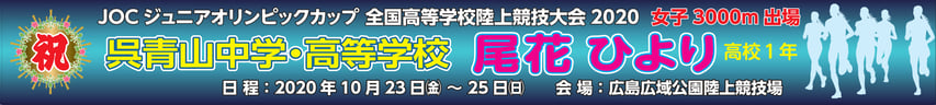 10月23~25日に広島広域公園で行われる,全国高等学校陸上競技大会2020に,高校1年生の尾花ひよりさんが3000mに出場することが決定いたしました。この大会はインターハイの代替の大会で,標準記録を突破した選手の中から上位40名のみが参加できる全国大会です。ぜひ自己ベストを更新し,さらなるレベルアップを期待しています。