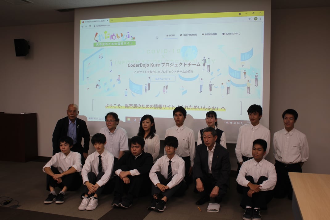 高校3年B組の亀井健一郎くんが、市民公益活動団体CoderDojo呉のプロジェクトに参加し、「くれためいんふぉ」という呉市の新型コロナウイルス感染症情報を分かりやすく発信する情報発信サイトを作成しました。そして10月6日(水)に、作成したサイトのプレゼンを、呉市長様を始めとする関係機関の方に行いました。呉青山の生徒として堂々と発表し、呉市長からもお褒めの言葉をいただきました。ぜひみなさんも「くれためいんふぉ」をご覧ください。