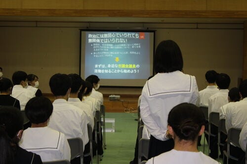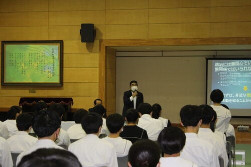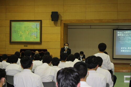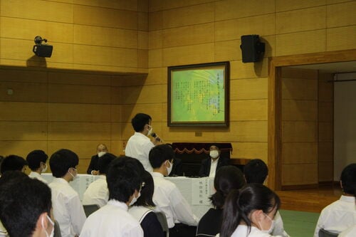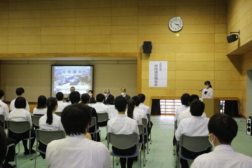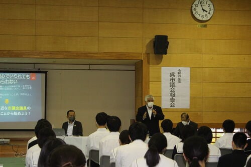 呉市議会の文教企業委員会の議員様にご来校いただき、高校生を対象に呉市議会報告会を実施しました。最初に、呉市議会の活動等について報告があり、その後、生徒からの質問に回答していただきました。生徒は事前に呉市のことについて調べ、各自が質問を考えて、「呉市には若者向けの商業施設が少ないが、今後作られる予定はあるのか?」や、「呉市で生まれ、育ち、学びたいと思う学生が増えるために、どのような魅力ある街づくりを進めていくか?」、「呉市の空き家対策はどのようになっているのか?」、「呉市の今後の産業についてはどのように考えられているか」などの質問を出していました。今日の報告会を通して、政治を身近なものと感じ、呉市のことに関心を深め、積極的に呉市政に興味をもって行動してもらえたらと思います。