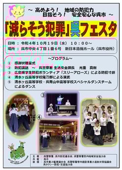 2022年10月19日、令和4年度全国地域安全運動の一環として、「減らそう犯罪」呉フェスタが開催されました。呉警察署、呉市防犯連合会、呉警察署管内地域安全協力会主催のもと、安心して暮らせる地域社会を作ることを目的として行われました。本校から清水ヶ丘高校・呉青山中学高等学校の生徒によるスペシャルダンスチームが活動に参加しました。生徒の生き生きとしたダンスをぜひご覧ください。