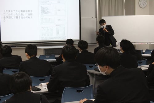 1月31日、2月1日の2日間で、中学3年生・高校1年生を対象に、金融投資教育を実施しました。講師には早稲田大学の教授や学生にご来校いただき授業を行ってもらいました。生涯で必要な費用を考えてその費用をどのように得るかを学習し、株式運用のリスクとリターンについて実際の事例を踏まえながら考察しました。大学の教授や学生による授業ということで難しい内容もありましたが、考察の時間には近くの生徒同士が意見を出し合って考えを深めたり、積極的に質問したりするなど、意欲的に授業に臨む生徒の姿勢が見られました。18歳で成人を迎え今後ますます金融の知識が求められる生徒にとって、人生とお金の関係について考える有意義な時間になったのではないかと思います。