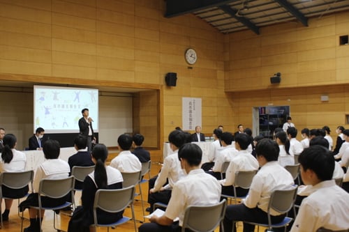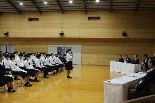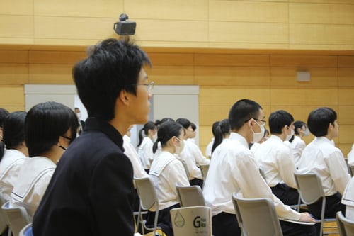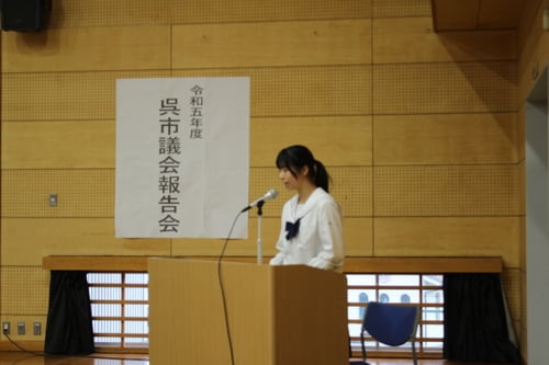 本日、高校生を対象に、呉市議会議員による議会報告会が行われました。呉市議会の文教企業委員会の議員より議会の活動などについて説明があった後、生徒からの質問に回答していただきました。生徒からは、呉駅前の開発の現状や見通し、日本製鉄の跡地利用、れんが通りの活性化、人口減少への対策、海や河川のごみ問題など、事前に調べた内容や日頃感じていることなどの質問が出され、例えば、呉駅前の開発については、交通ターミナルや商業施設やまちづくりを推進するアーバンデザインセンターなどの設置が検討されているとの回答がありました。生徒代表からは、呉市について考える良い機会となったので、意見を出して今後の呉市の改善に貢献していきたいとのお礼の言葉がありました。今回の報告会をとおして、一人一人が政治に関心を持ち、積極的に行動していってもらえたらと思います。