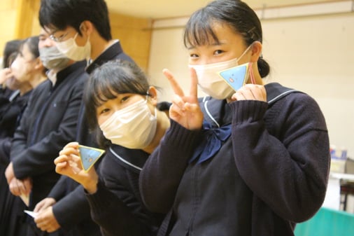 中学部を代表して中学3年生が,呼びかけコール形式で,高校3年生に感謝の気持ちと応援メッセージを心を込めて伝え,高校生ははにかみながら合格種を受け取っていました。