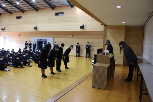 表彰式では卓球部が全国高等学校選抜卓球大会中国地区予選会を見事勝ち抜き,全国大会の切符を手にしたこと,「2023 みんなの夢・アイディアコンテスト」で中学3年生が3名,中学2年生が1名の計4名が夢コン賞を受賞したことを表彰しました。このコンテストは「あったらいいな!こんなモノ」「できたらいいな!こんなサービス」というアイディアを呉市内外より募集し,アイディアによっては商品化の検討や,提案者の試作希望に対する支援などが行われるという趣旨のもので,本年度,本校は『学校賞』もいただいております。スポーツに学業に,今年も実りある1年にしていきましょう。