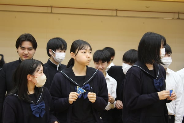 いつもは拍手で迎える三年生。今日はアリーナの扉を開けると,拍手で迎えられた高校3年生。少し照れた笑顔にキュンとしました。そうです,今日は中学部で種を植えて大事に育ててきた「合格種」を渡す集いです。中学3年生全員で,中学部を代表し,高校3年生への感謝の気持ちと応援メッセージを,呼びかけコール形式で心を込めて伝え,合格種を1人1人に手渡しました。お互い緊張気味で,「初めてのお見合い!」のようなぎこちなさもありましたが,高校3年生にもとても喜んでもらえて,幸せな時間と空間を共有できました。