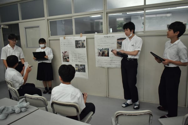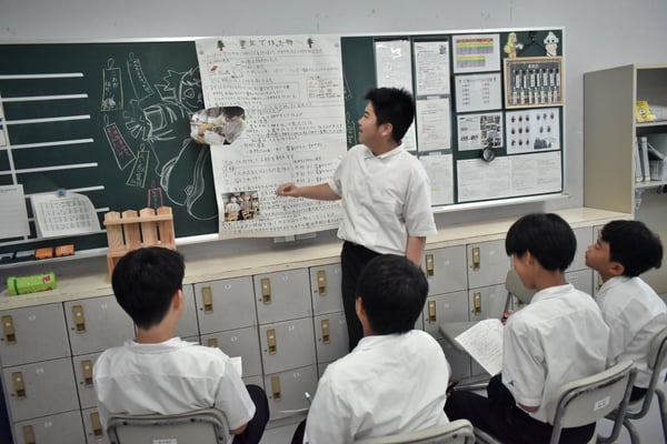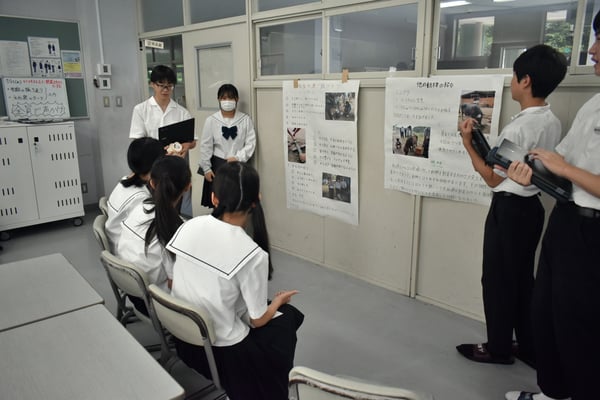 今日は6月12日に実施した、中学2年生、3年生の体験学習(あぐりファーム・豊北木材・みんなの牧場)のポスター発表会を行いました。大学説明会のブースをイメージして、自分たちが体験して学んだことをプレゼンし、聞き手からの質問に答えたりしました。どのような構成にしたら聞き手に伝わるかなど、無数の工夫ができるだろうと思い、あえて今年は手書きのポスター発表にしました。一人ひとりが役割を担い、「ああでもない、こうでもない・・・」と,ポスター発表に向けて試行錯誤しながら、また、放課後や昼休憩も活用しながら準備してきました。